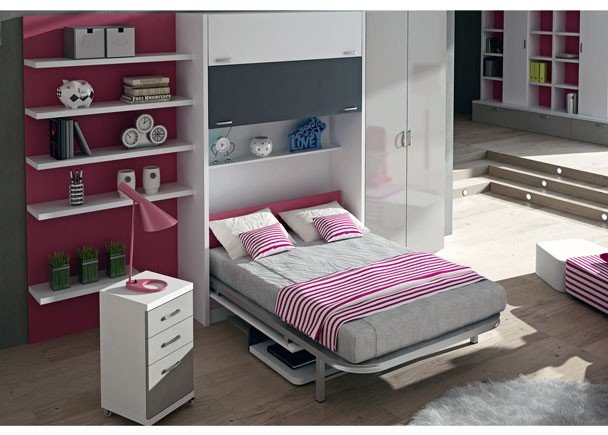 This room corresponds to the passage area of a living room, where a bookcase has been placed, made with a low sideboard composed of two levels of drawers and a series of vertical uprights with shelves. The distribution of these elements has been conceived as cells between which long doors arranged vertically are interspersed, giving rise to a symmetrical, balanced and very attractive ensemble.