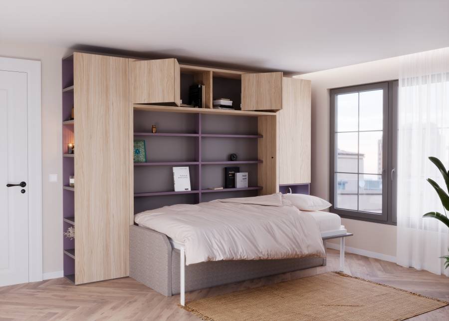 Transform your living room into a multi-purpose space with this multi-functional setting. The horizontal double folding bed discreetly folds away to reveal a comfortable sofa during the day. Integrated wardrobes offer practical storage without compromising on style. From relaxing during the day to resting at night, this bespoke piece of furniture combines comfort and practicality with a touch of customizable elegance. Simplify your space without sacrificing design.