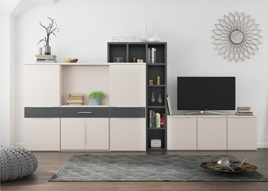 On this occasion we present a symmetrical living room with side cabinets and a loft module bordering the NORDIK horizontal folding double bed with sofa. On the front wall, the room has been completed with a combination of Tetris modules that demonstrate their great versatility when it comes to composing the most different spaces.