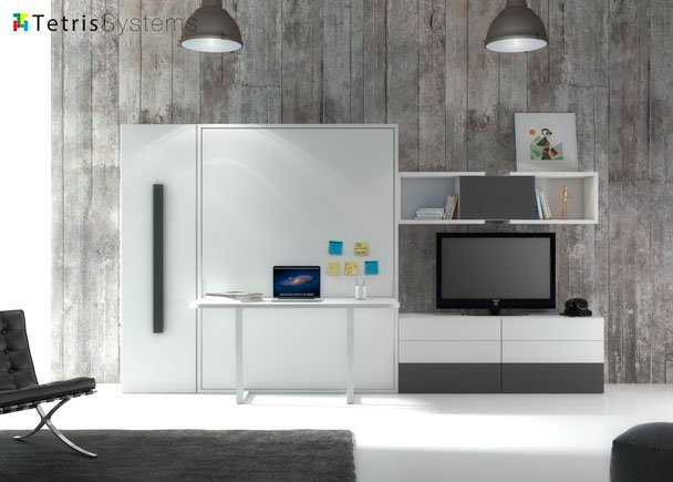 The living room with a fold-down bed and built-in desk is one of the most requested space optimization solutions.