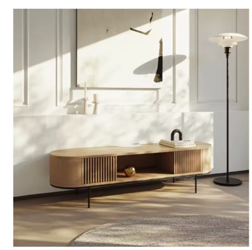 The TV unit is a modern media console with a combination of open and closed storage: