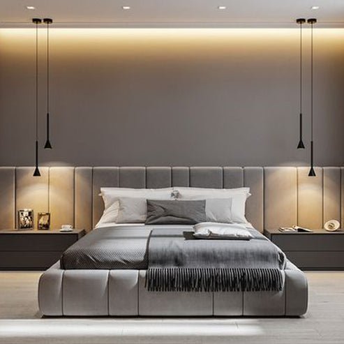 The bed is a platform bed with a large, upholstered headboard. The headboard is inset with a rectangular panel with a button-tufted design. The bed frame is made of wood and has low profile legs.