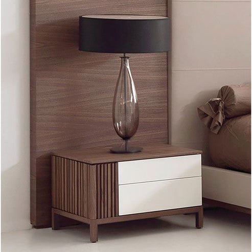 The nightstand is a simple, mid-century modern design nightstand. It has a single drawer with a rectangular cutout for a knob.