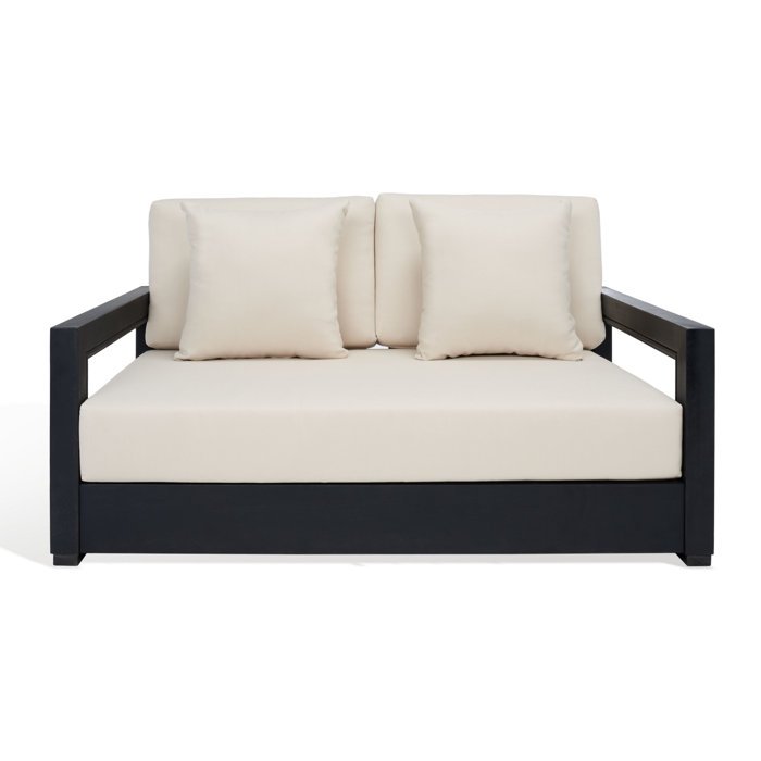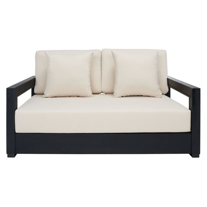 Sit down, relax, and unwind in this cozy Melrose Loveseat. Styled with contemporary cut-out arms in sleek metal and plush upholstery, designers use them in pairs for an instant outdoor conversation area.