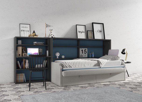 Designed for a youth bedroom or a one-room studio, the DIVERSO folding system integrates a horizontal folding bed with a practical sofa with a 70 cm deep seat and a backrest with a kidney pad, which gives it great comfort.