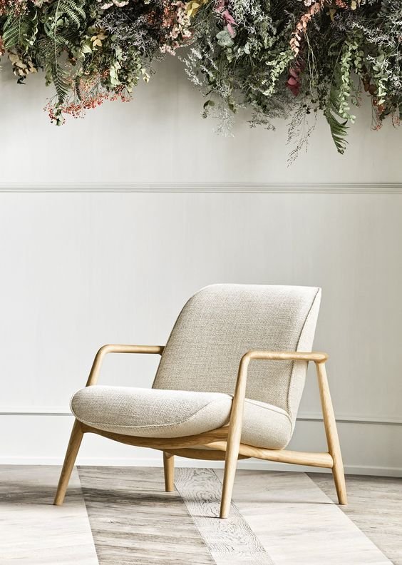 The armchair is white and has wooden armrests. It is sitting on a wooden floor in a living room. Here is a description of the armchair: