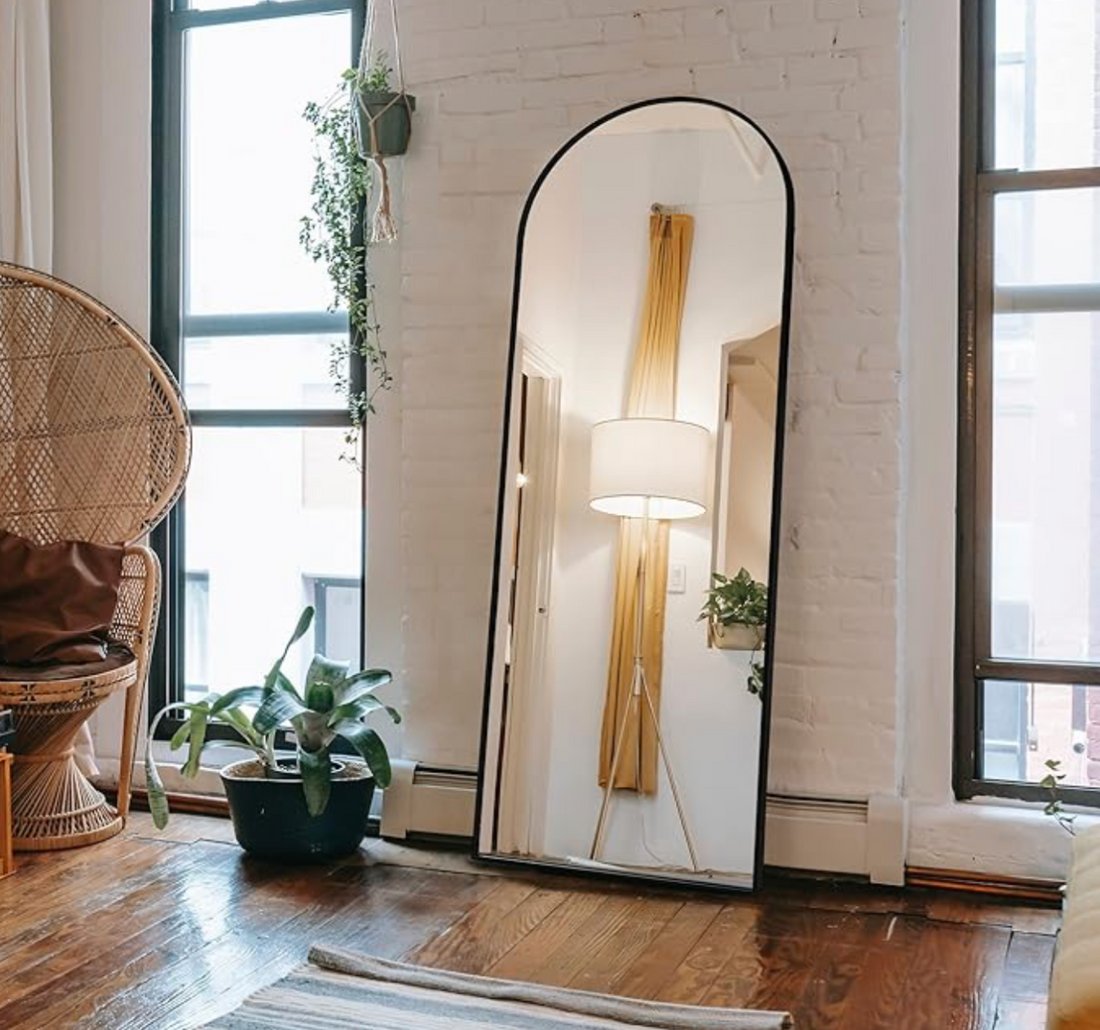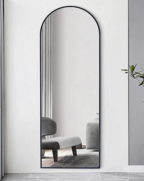 This is a full-length mirror with a black frame. The mirror is hanging on the wall in a living room. Here are some additional details: