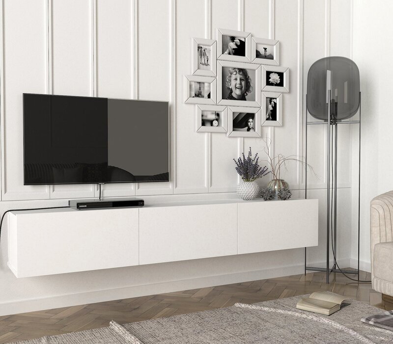Ozge TV Stand for TVs This contemporary piece is a little media console with a lot of storage. It’s available in two different hues.