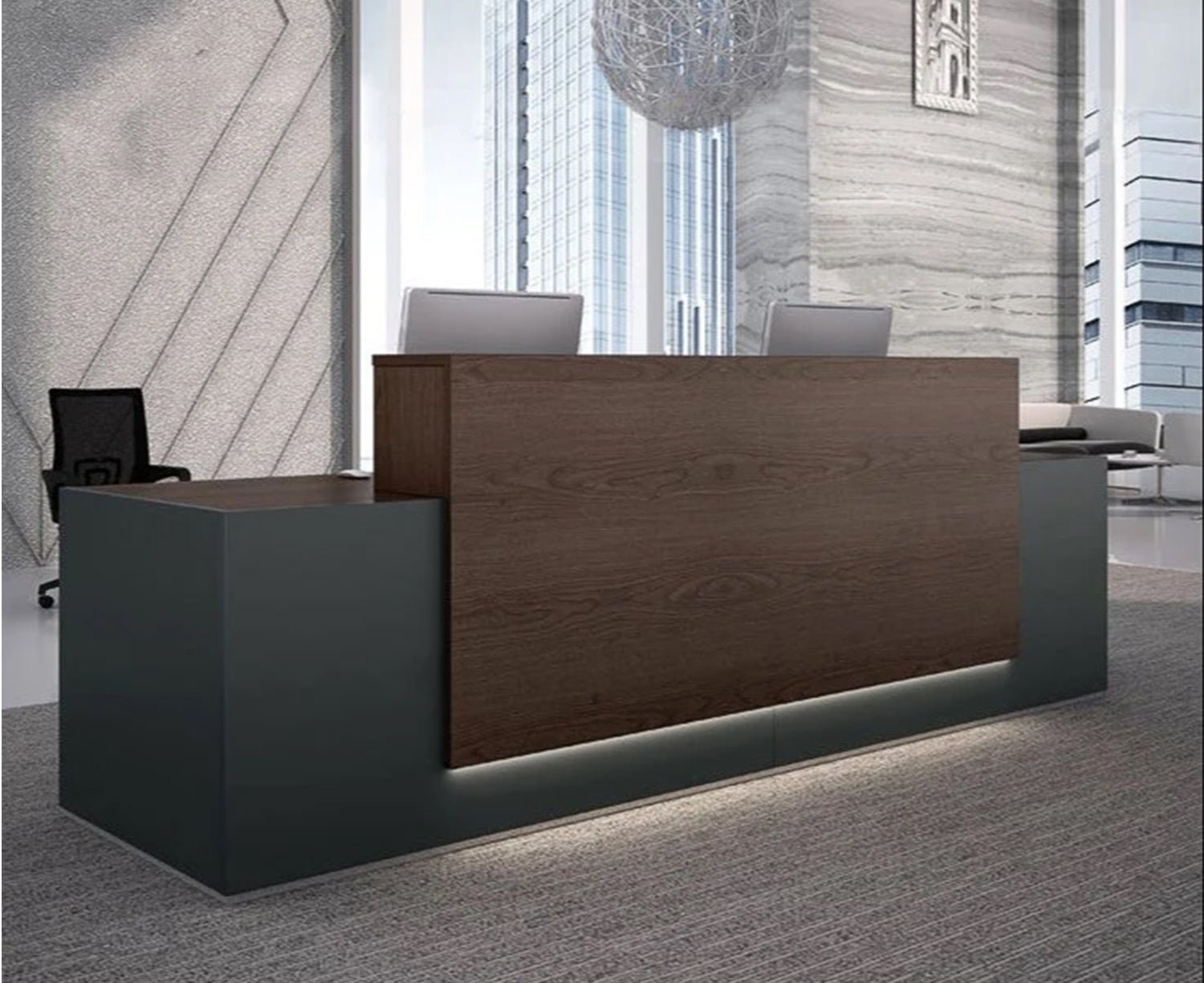 An elegant reception counter made of luxurious Spanish MDF wood, featuring a smooth and matte finish that gives it a modern and elegant character. The warm colors of the wood complement its simpdesign lines, providing a professional and attractive look. Its spacious surface has plenty of room for desk tasks, with hidden storage keeping things tidy and organized. Perfect for making a welcoming first impression in any modern office environment.