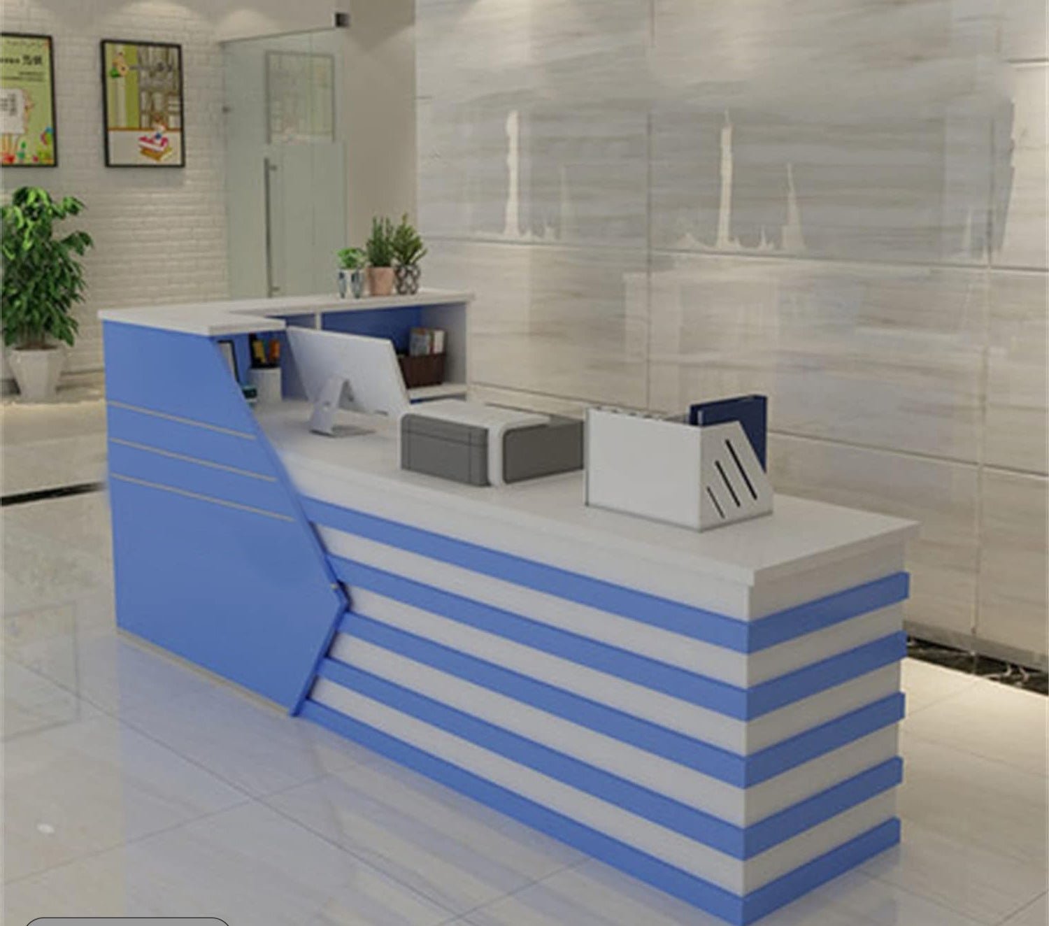 An elegant reception counter made of luxurious Spanish MDF wood, featuring a smooth and matte finish that gives it a modern and elegant character. The warm colors of the wood complement its simpdesign lines, providing a professional and attractive look. Its spacious surface has plenty of room for desk tasks, with hidden storage keeping things tidy and organized. Perfect for making a welcoming first impression in any modern office environment.