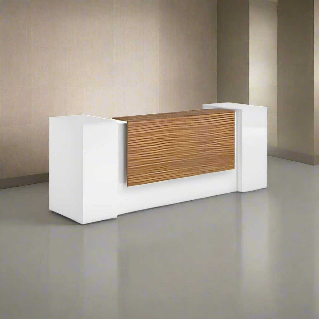 An elegant reception counter made of luxurious Spanish MDF wood, featuring a smooth and matte finish that gives it a modern and elegant character. The warm colors of the wood complement its simpdesign lines, providing a professional and attractive look. Its spacious surface has plenty of room for desk tasks, with hidden storage keeping things tidy and organized. Perfect for making a welcoming first impression in any modern office environment.