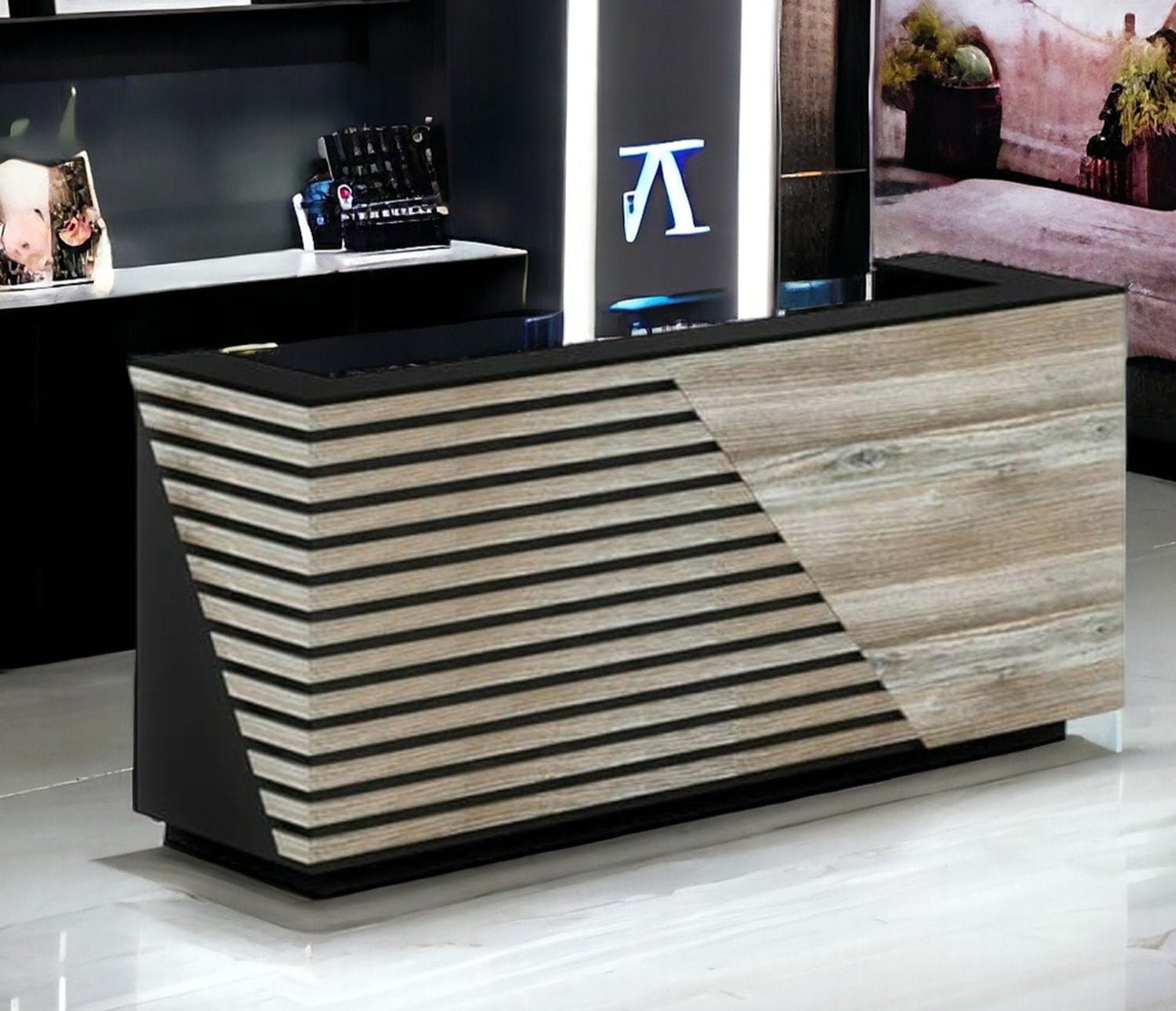 An elegant reception counter made of luxurious Spanish MDF wood, featuring a smooth and matte finish that gives it a modern and elegant character. The warm colors of the wood complement its simpdesign lines, providing a professional and attractive look. Its spacious surface has plenty of room for desk tasks, with hidden storage keeping things tidy and organized. Perfect for making a welcoming first impression in any modern office environment.