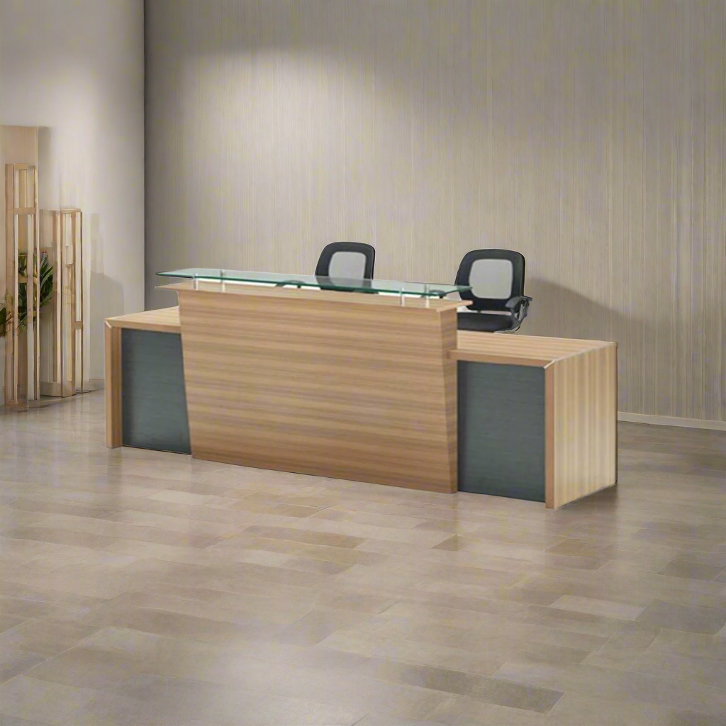 An elegant reception counter made of luxurious Spanish MDF wood, featuring a smooth and matte finish that gives it a modern and elegant character. The warm colors of the wood complement its simpdesign lines, providing a professional and attractive look. Its spacious surface has plenty of room for desk tasks, with hidden storage keeping things tidy and organized. Perfect for making a welcoming first impression in any modern office environment.