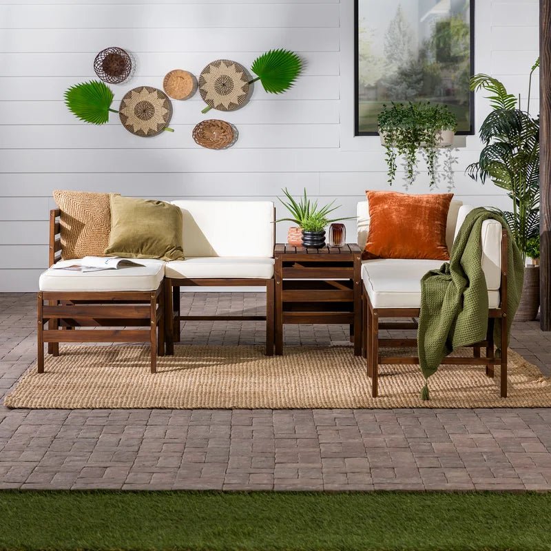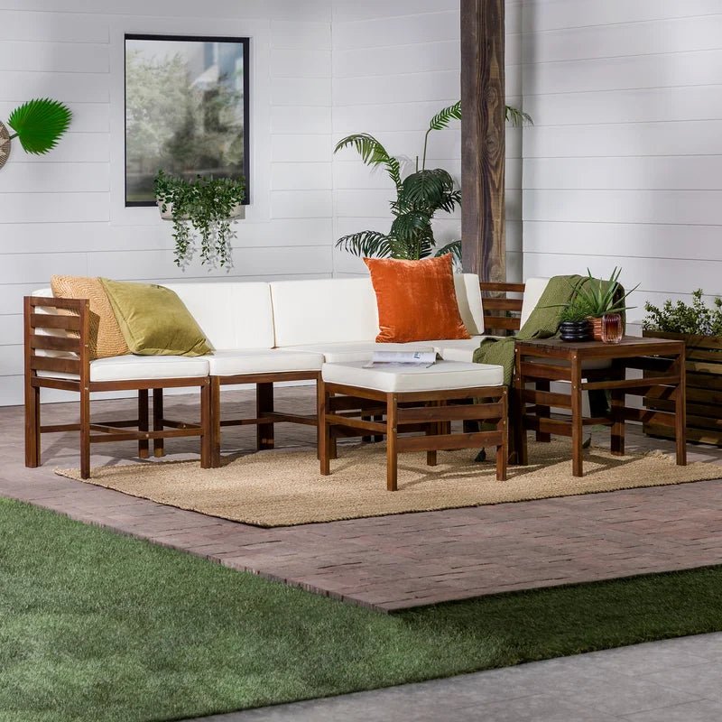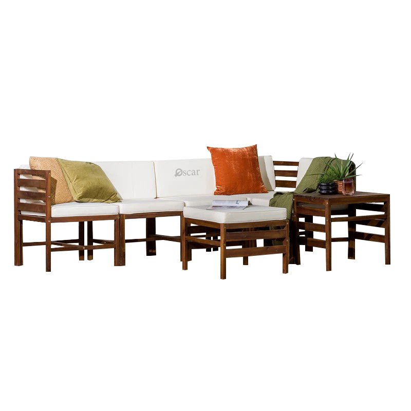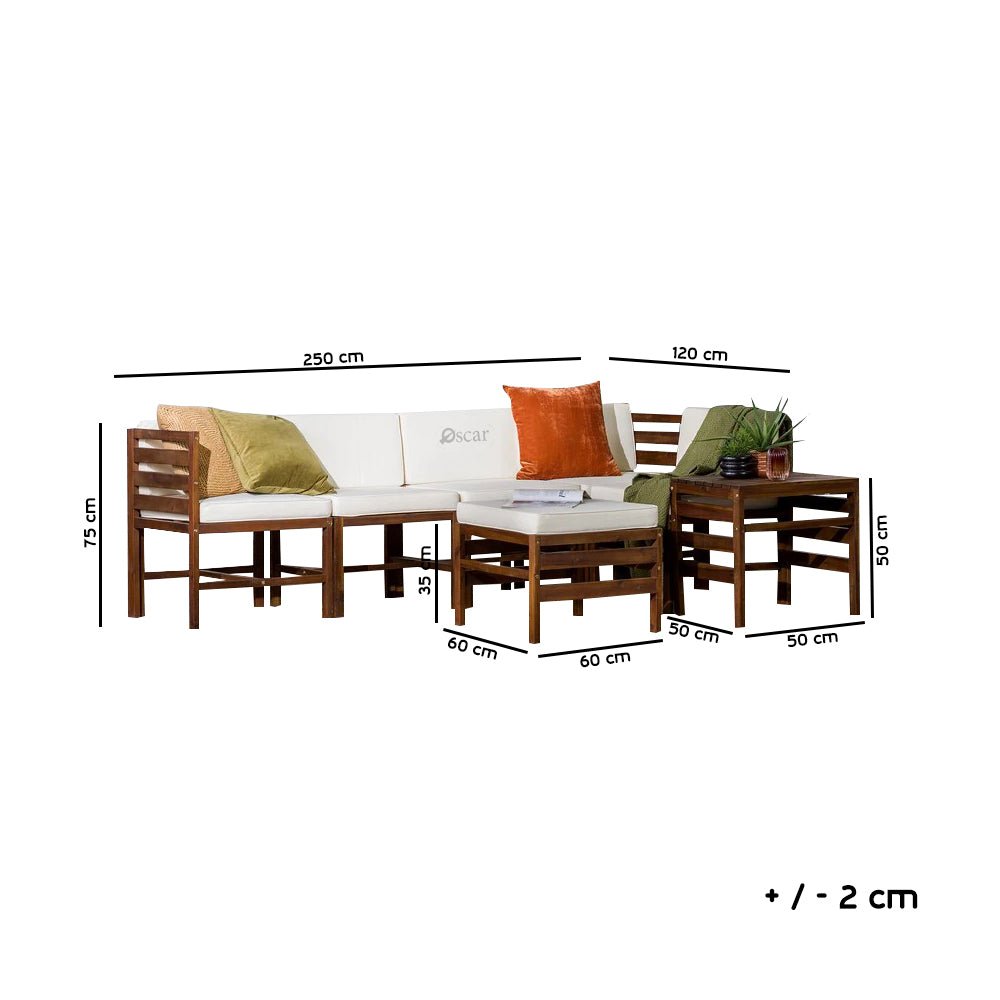 Create a cozy corner in your outdoor area. The warm shade of red beech wood combined with the simpstructure of this piece of furniture is sure to decorate your garden, patio, or terrace. The set consists of 4 chairs that can be combined or used separately and a side table, ensuring you have a side space for your drink.