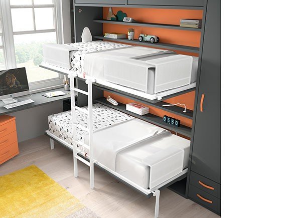 Children’s room with folding bunk beds for a 90 x 190 mattress. The bed frame has a loft with lift-up doors.