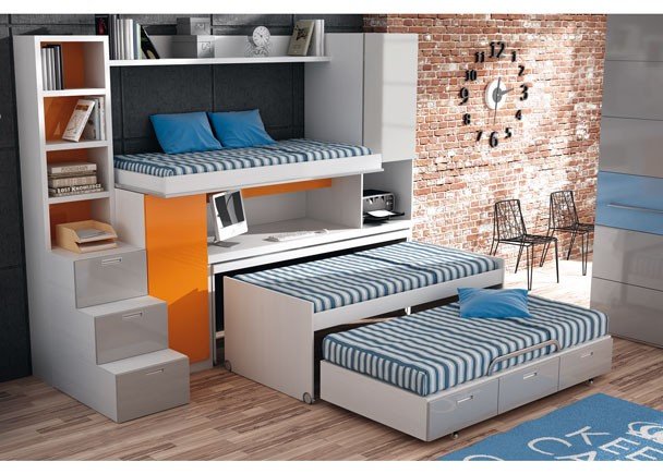 Youth bedroom with self-supporting compact furniture with 90×190 bunk bed, trundle bed and two wardrobes. Total height 238.5 cm.
