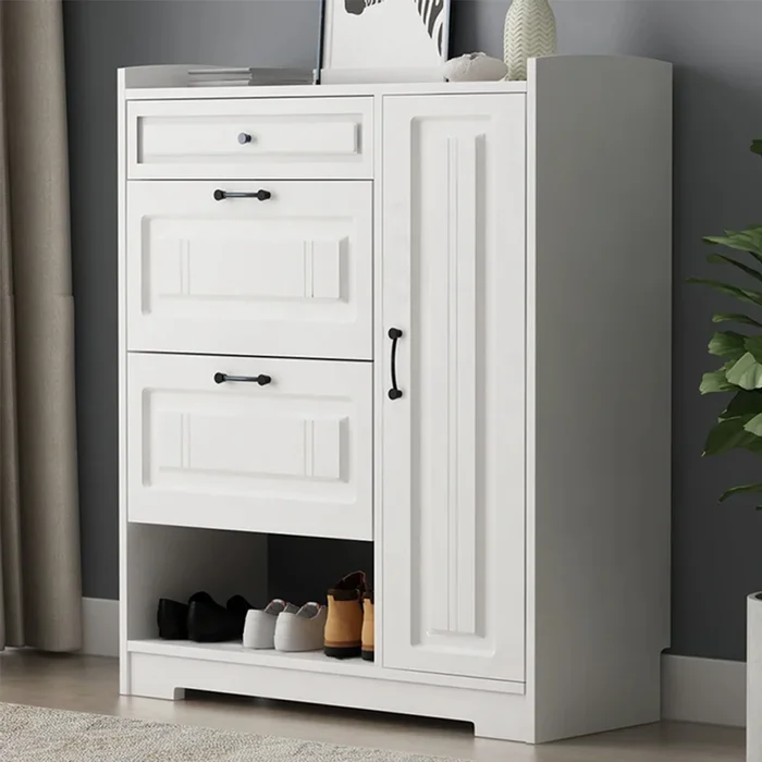 Looking for a stylish and practical shoe storage solution? Check out our classy Separ Wood Shoe Storage Cabinet which is made of natural wood. It has two flip down drawers and a side cabinet for high heels and boots, and a lower open shelf.