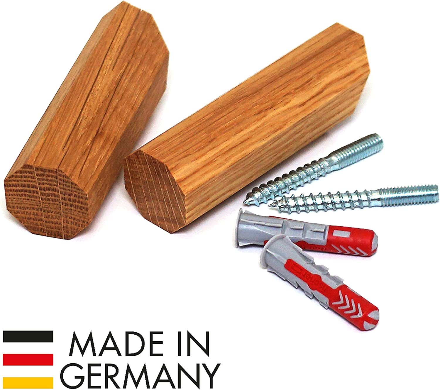 - Material: 100% oak. Dimensions: 2.6 x 2.6 x 8.5 cm. Fixed installation with screws. The maximum load capacity is 6 kg per holder. Package with 4 x wooden hooks, 4 x screws, 4 x high quality dowels. Ideal for use on doors, flaps, walls (over 4.5cm thick) in the hallway, foyer, entrance, office, workshop, kitchen, studio Attaching the jacket hooks is easy.