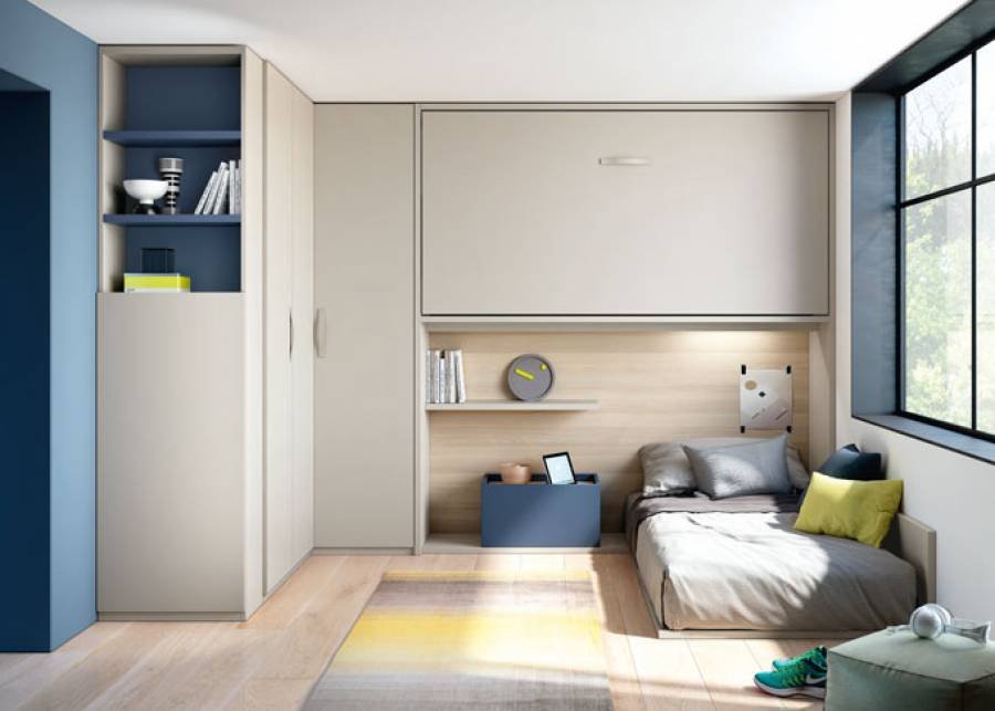 Space where a complete corner wardrobe is presented to make the most of and to be able to store a multitude of clothes and other objects. Next to the wardrobe, a Murphy bed with a bed at floor level has been installed
