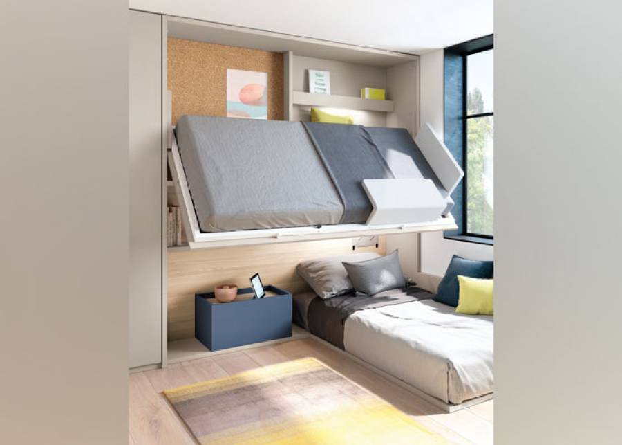This room corresponds to a youth bedroom designed in a “U” shape, equipped with a horizontal folding bed, leaving the lower space as a headboard for the second bed. Next to the bed, the furniture has been completed with a corner wardrobe area finished off by a shoe rack.