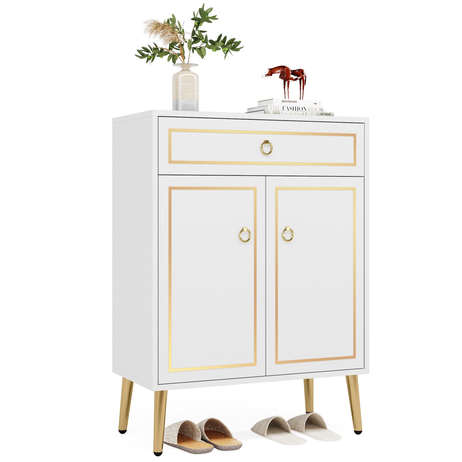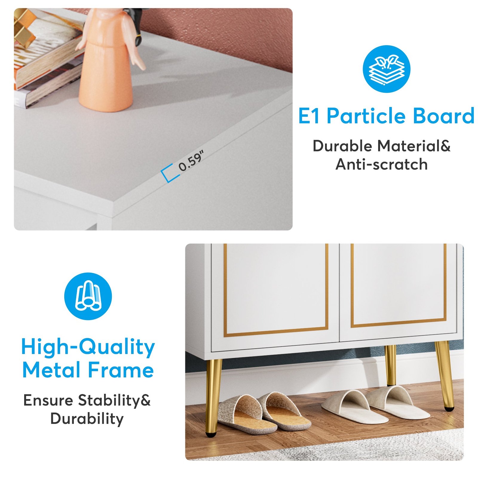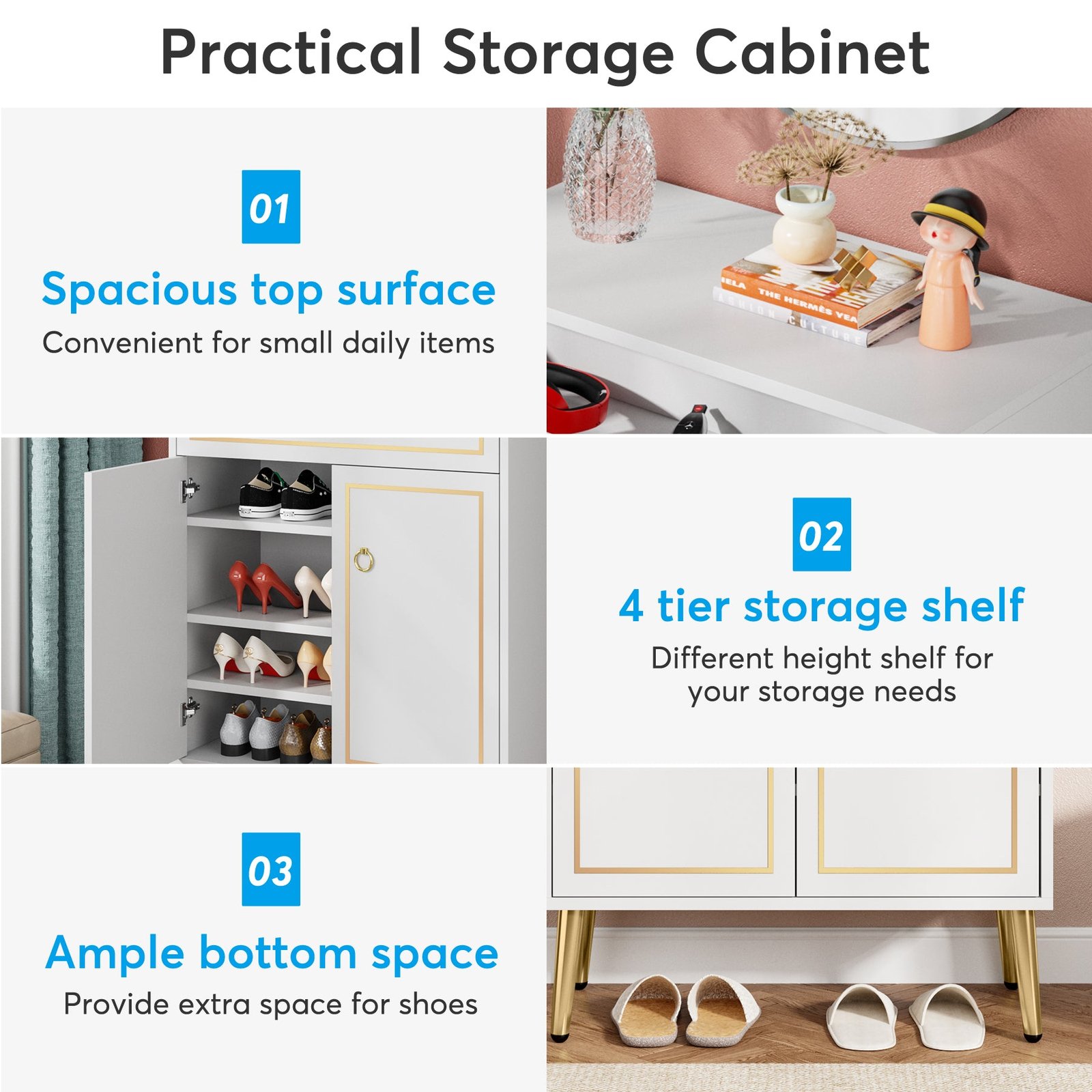 Space Saving & Large Capacity ? Free-standing narrow shoe cabinet with 4-tier adjustable storage shelves for the entryway is a slim but large capacity, holding up to 16-18 pairs of shoes. With a removable and adjustable height shelves design, meet most of your needs for different shoe storage, it can perfectly fit boots, high heels, or slippers. No more worried about the mess of the entryway with too many shoes lying on the floor.