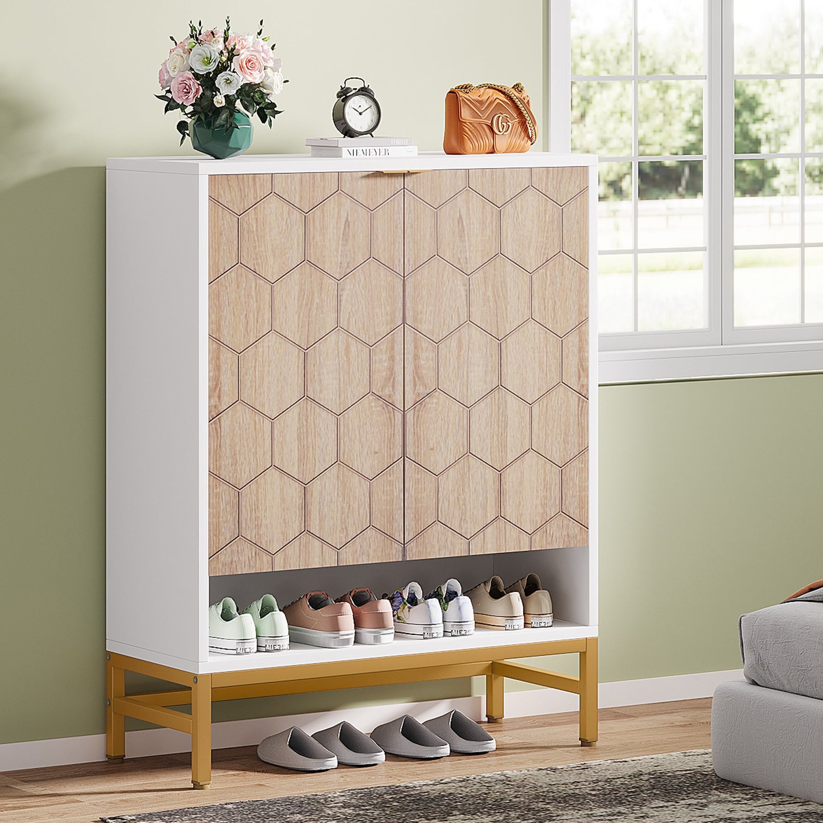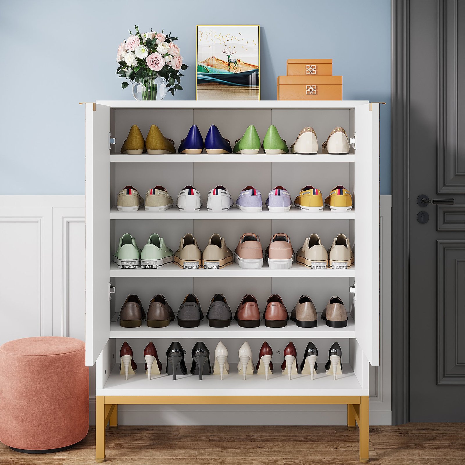 PERFECT SHOE STORAGE SOLUTION ? With the oversize of 13.77?? D X 31.49?? W X 41.34?? H, this shoe cabinet with 5 shelves can store up to 20-25 pairs shoes (Depending on the sizes of different shoes). Panels inside doors are adjustable to categorize your different shoes storage from slippers to high heels or long boots. Perfect shoe organizer to keep your messy shoes well sorted.