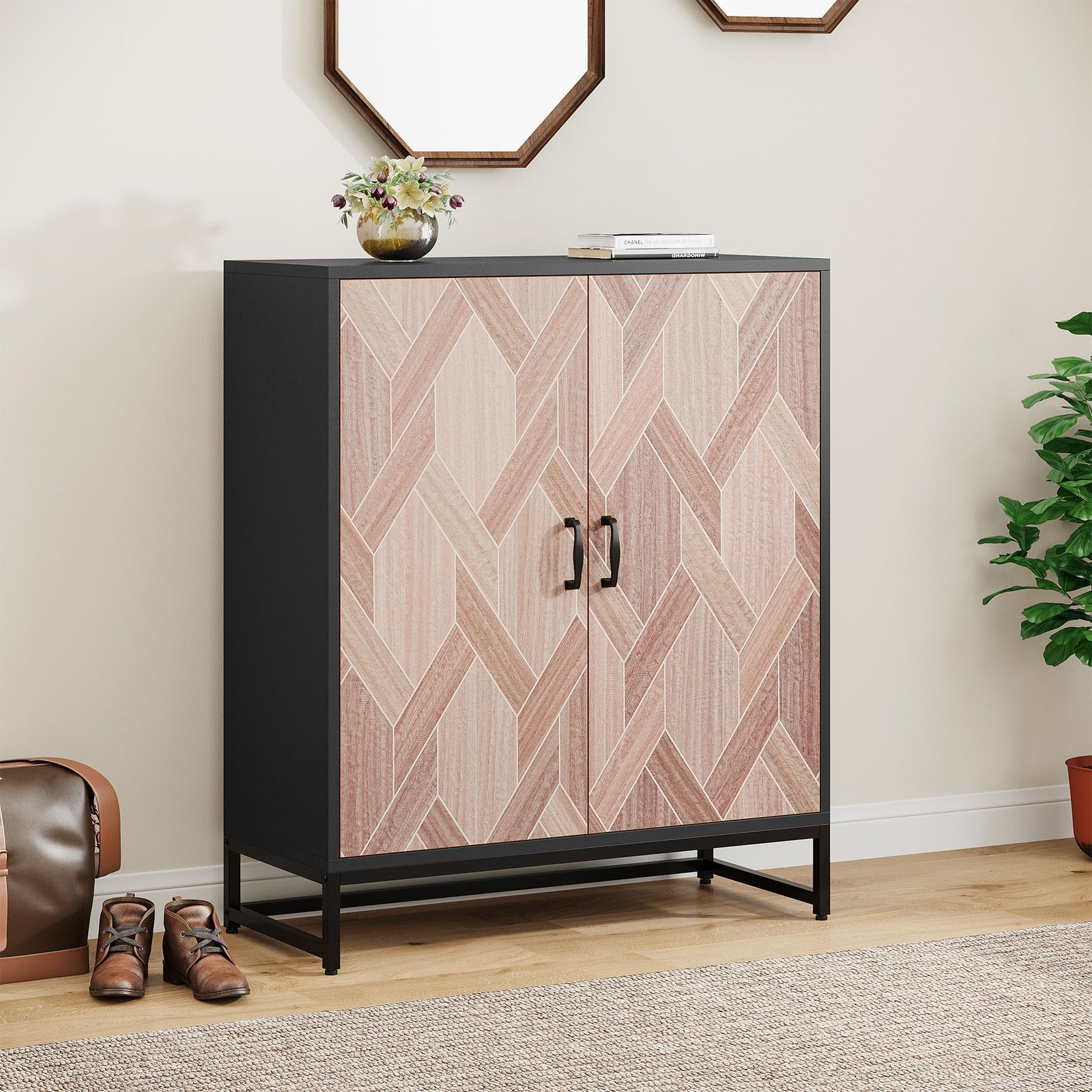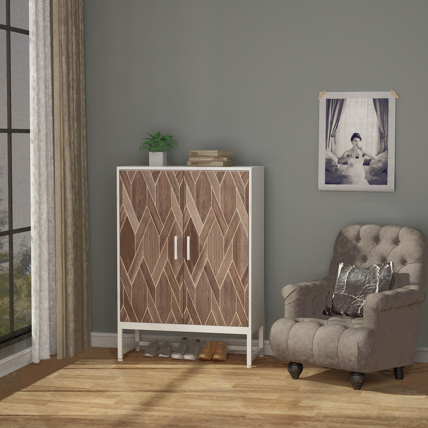 Stylish Storage Solution ? Still looking for a stylish way to hide/store your shoes when coming from the outside or house guest?s shoes when they come in the house? Don?t miss this sharp-looking piece! With a sleek and modern design, shoe cabinet features elegant and funky fawns colors front panel contrasts dark gray back, so clean and high-end, stylishly keeps your shoes hidden and spruces up your entryway.