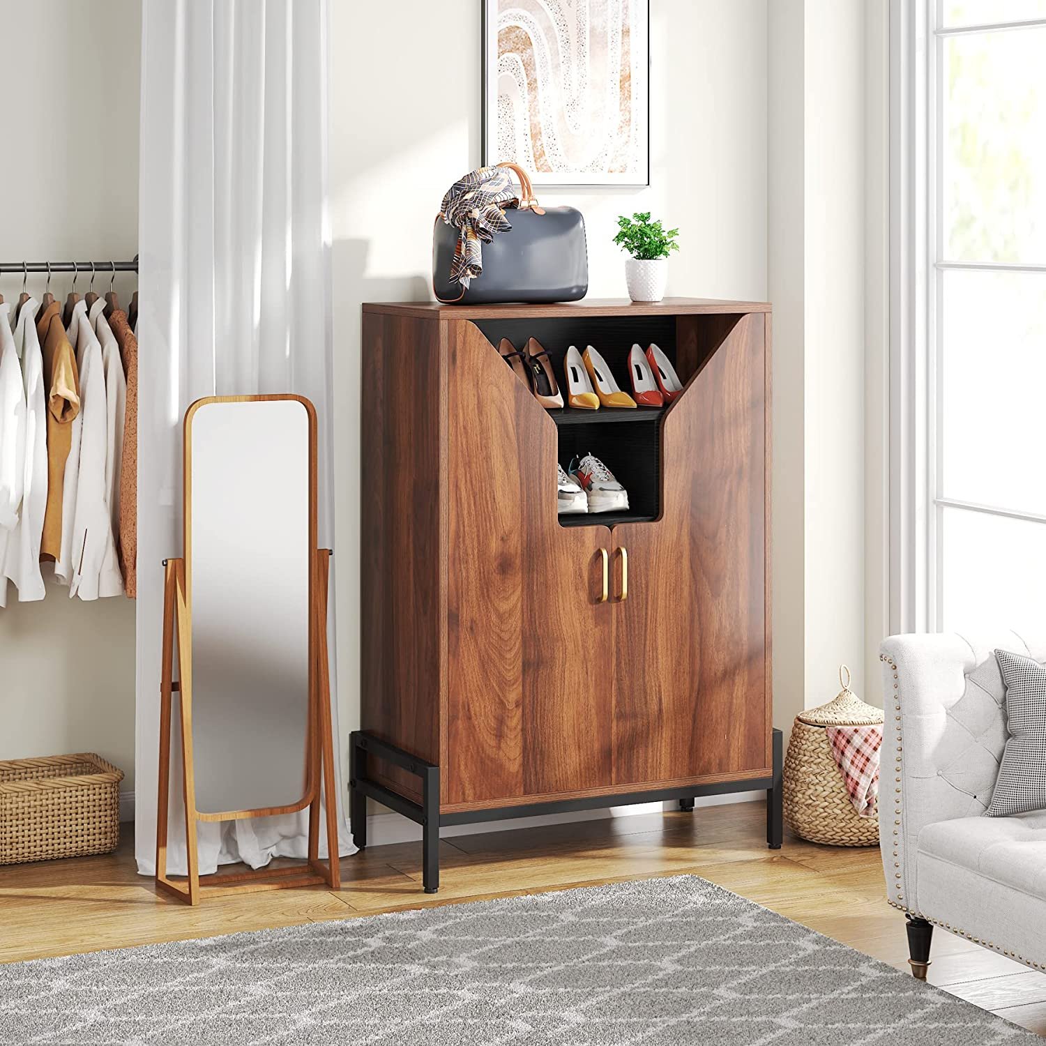Shoe Cabinet with Doors ? This entryway shoe cabinet is adopted with high-quality MDF particle board and metal frame which offers strong support, vintage brown with doors, and gold handle to suit any interior style.