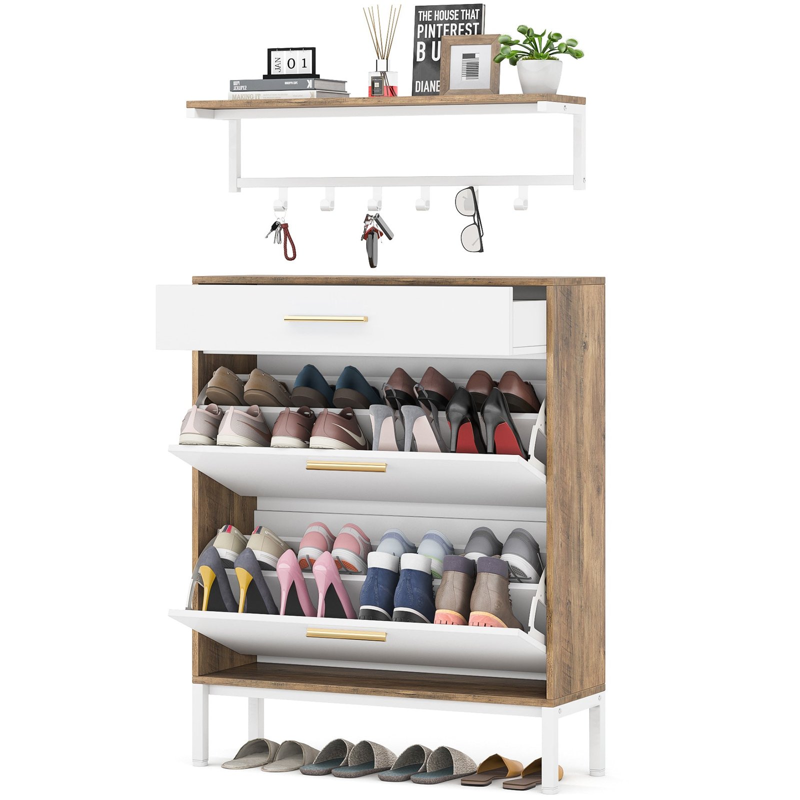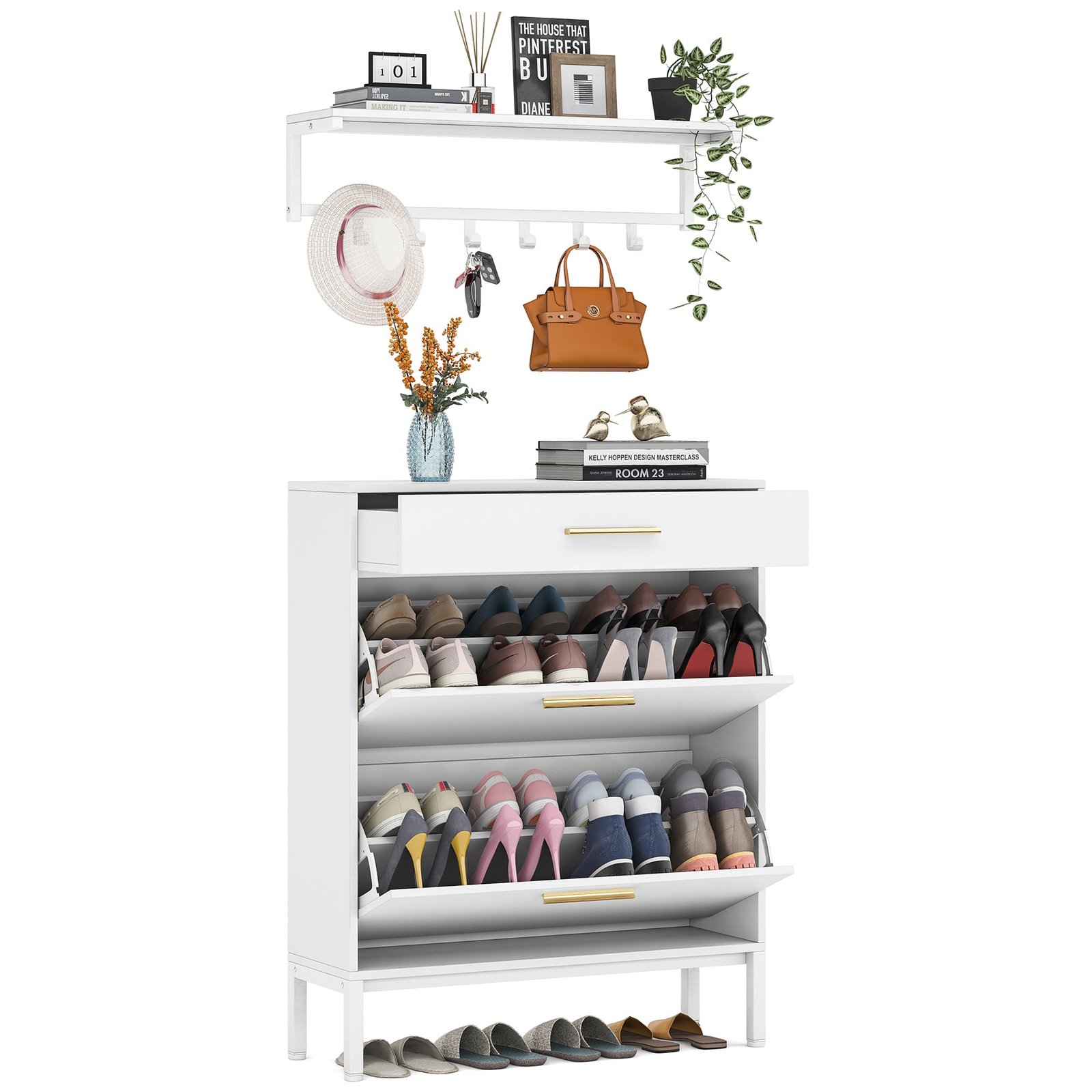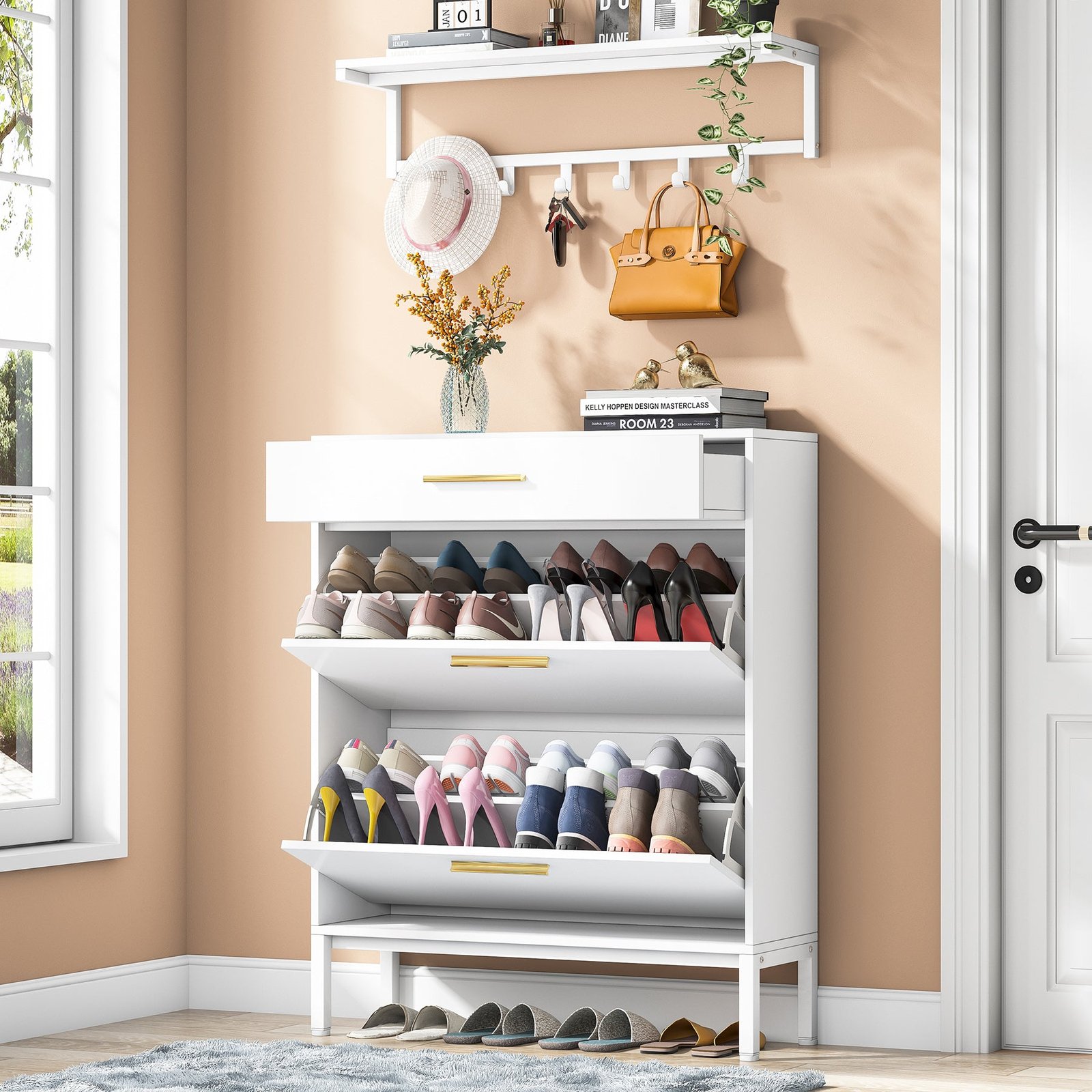 2 in 1 Narrow Shoe Cabinet with Wall Shelf ? Featuring 1 wall-mounted Coat Rack with Shelf + 1 pull-out drawer + 2 folding drawers, this shoe rack closet organizer shoe cabinet for entryway slim enables you from clothing hats, scarfs, headphones to shoes be armed to the teeth. Size: 31.5?Lx 9.45?Wx 43.31?H.
