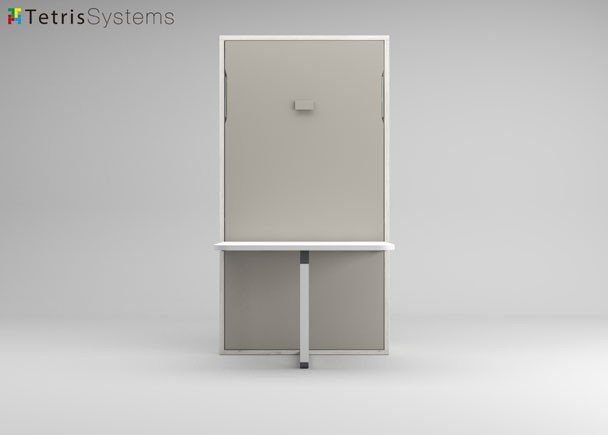 Vertical folding bed with built-in table. The folding bed measures 111 x 45 x 209 cm in height and is prepared for a mattress of 90 x 190 cm and a maximum thickness of 18 cm. It is also manufactured in sizes of 105 x 190, 135 x 190 and 150 x 190 cm in length and even for special measurements to fit your space. When extended, it moves 221 cm away from the wall.