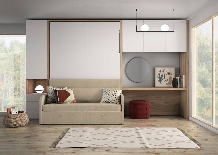 Whether it’s a study, an office, a living room or a guest room, you can equip these spaces with this bunk bed with integrated sofa to create a bedroom anywhere in the house in just a few minutes. This vertical folding bunk bed makes the most of the space, as it has a double lower bed, a single upper bed and an integrated sofa with drawers at its base. The space includes a work table along with a three-door loft unit and a wardrobe with one door, three drawers and a central space at the other end of the bed.