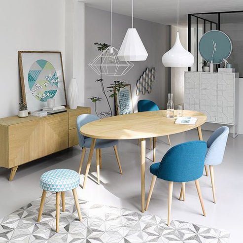 The dining set features a crisp white rectangular table with a pedestal base. Surrounding the table are four mismatched chairs, each offering a unique look: