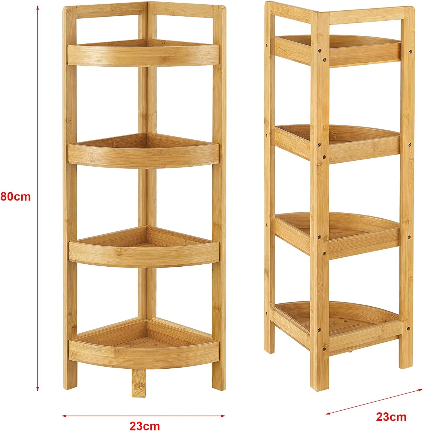 - The practical angle shelf made of bamboo is maximum space-saving and is suitable for e.g. Perfect for your kitchen or bathroom. It has 4 shelves for storing all your bathroom utensils or kitchen items.