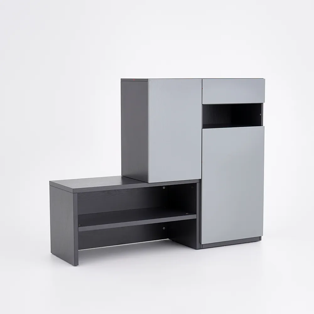 - Ample space for storage, two doors with shelves, and an additional bench provide more space.
