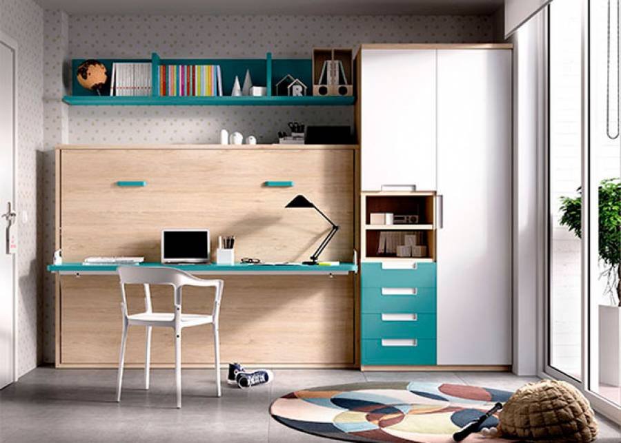 The environment that appears in this image corresponds to a room-studio with double use as a bedroom , equipped with a horizontal folding double bed with a desk, for a mattress size of 135 x 190, on which a 202 cm long shelf has been hung .