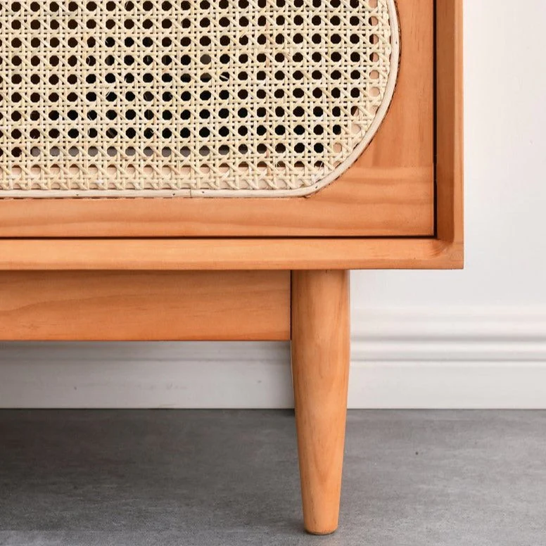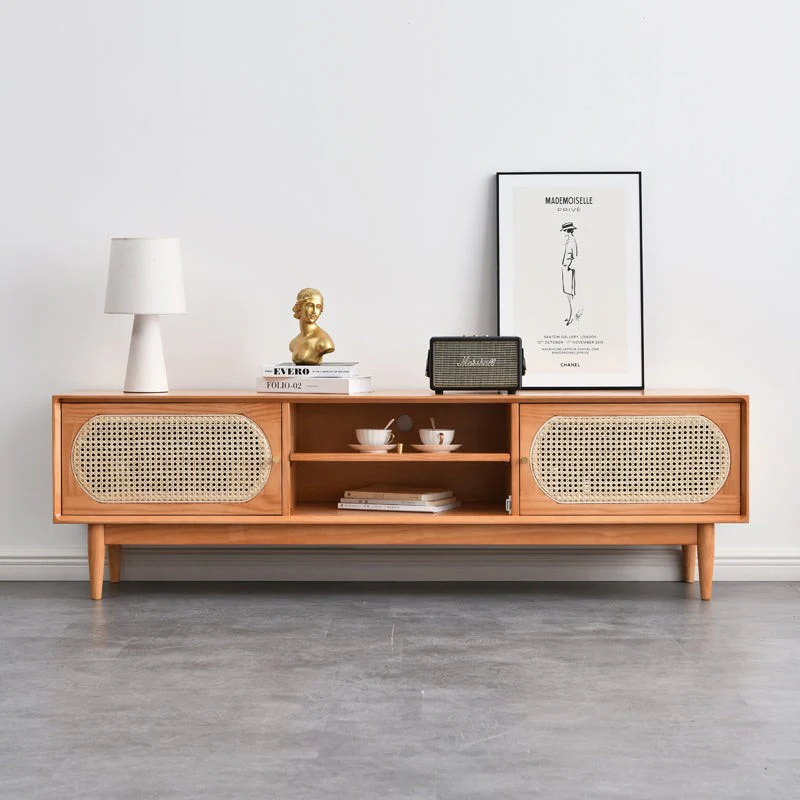 This TV stand is a stylish and practical focal point for your living room or dinner room. It has open shelves and sliding doors for storage. Solid wood and rattan make it durable and eco-friendly. It resists deformation and cracking from temperature and humidity changes. With its simple shape and neutral color, it suits any decor .