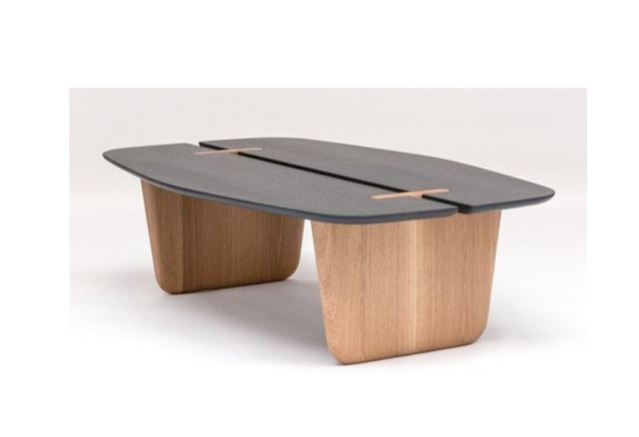 The coffee table is a round, mid-century modern style table with a black top and wooden legs. Here are some details about the table: