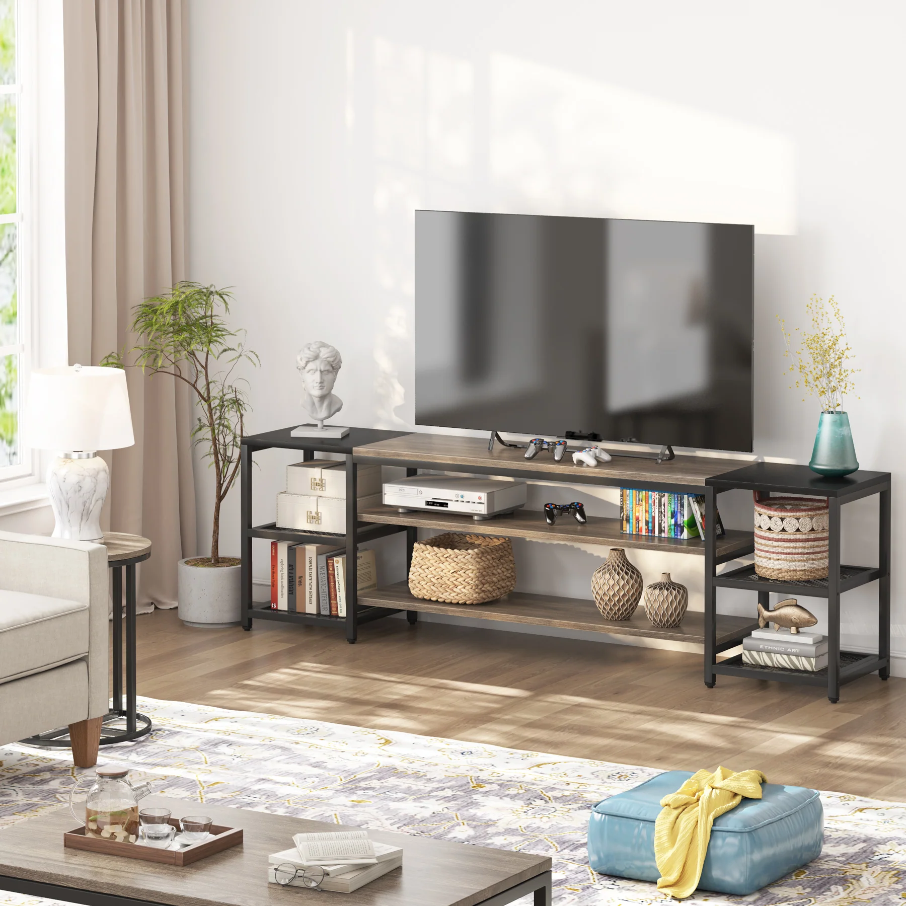 Luxurious Dimensions ? The extra large television stand with a large size:78?(L) x 15.74?(W) x 27.56?(H), which is designed to accommodate TVs up to 65 Inches & Up. The large size gives your 70 inches & Up big screen a proper place to rest on the TV Stand and offers support for a visual feast.