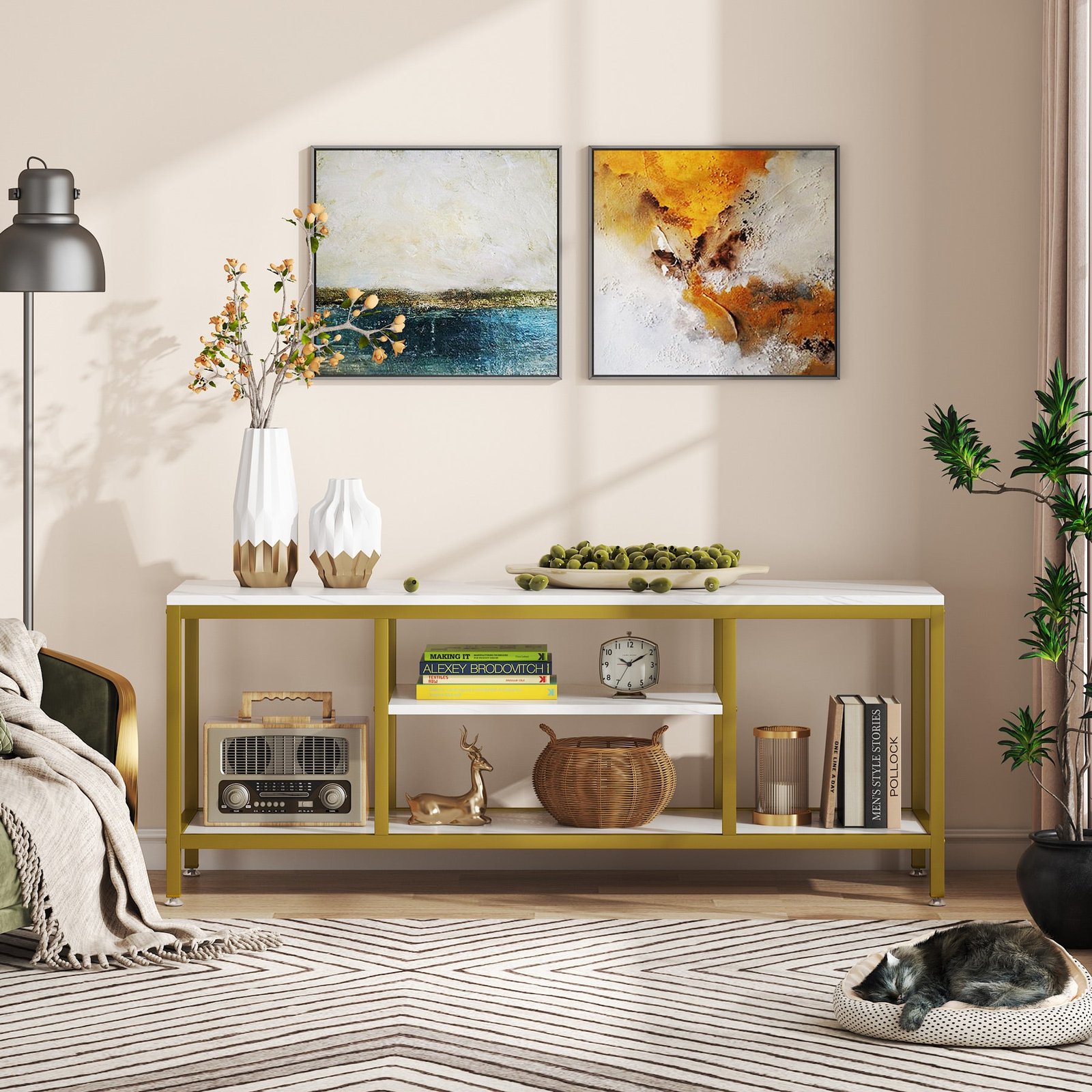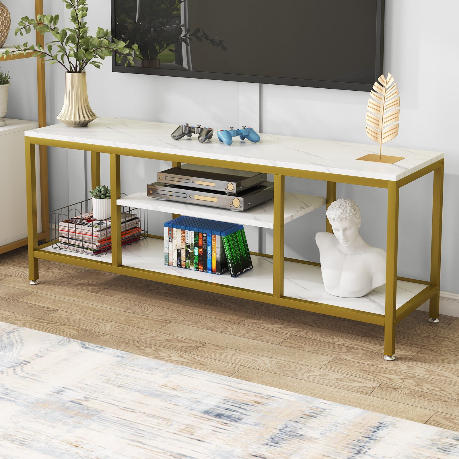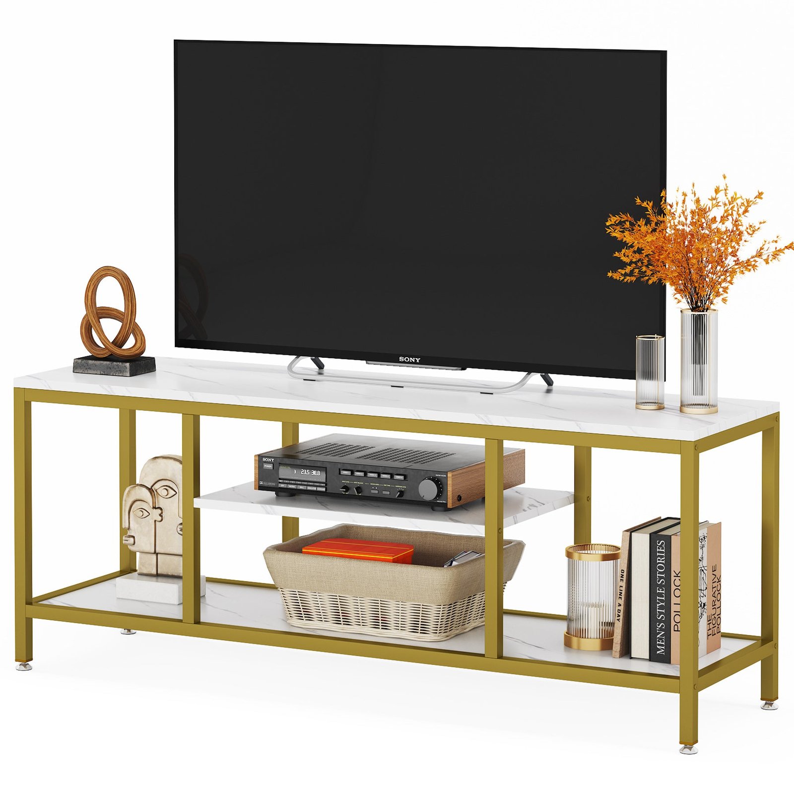 Accommodate Flat Screen TVs up to 65? ? The table top of the TV stand measures 59.05? (L) x 15.66? (W), which is spacious enough to fit television panels up to 65?. In addition, the entertainment console will be a perfect complement, whether you put the television on the tabletop or mount it on the wall. It also can provide space to stash and store while lending visual appeal to any ensemble whether placed in the living room, bedroom, master suite or home office.
