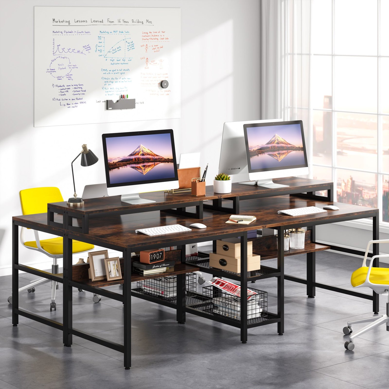Multi-purpose 2-Person Desk ? The double desk provides interference-free working for you and your partner, two-person can share space and working resources! Elegant wood grain with a black frame delivers a warm and harmonious atmosphere! Not only a long computer desk but also can be used as a workstation desk, study table, or gaming desk.