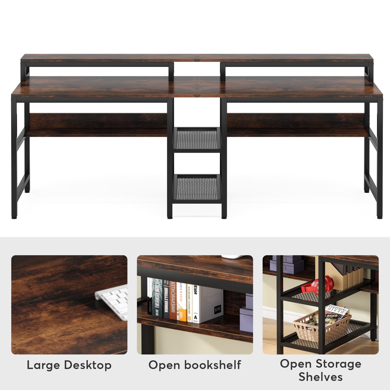 Two Person Desk, 78.7? Double Computer Desk with Monitor Riser & Shelves
