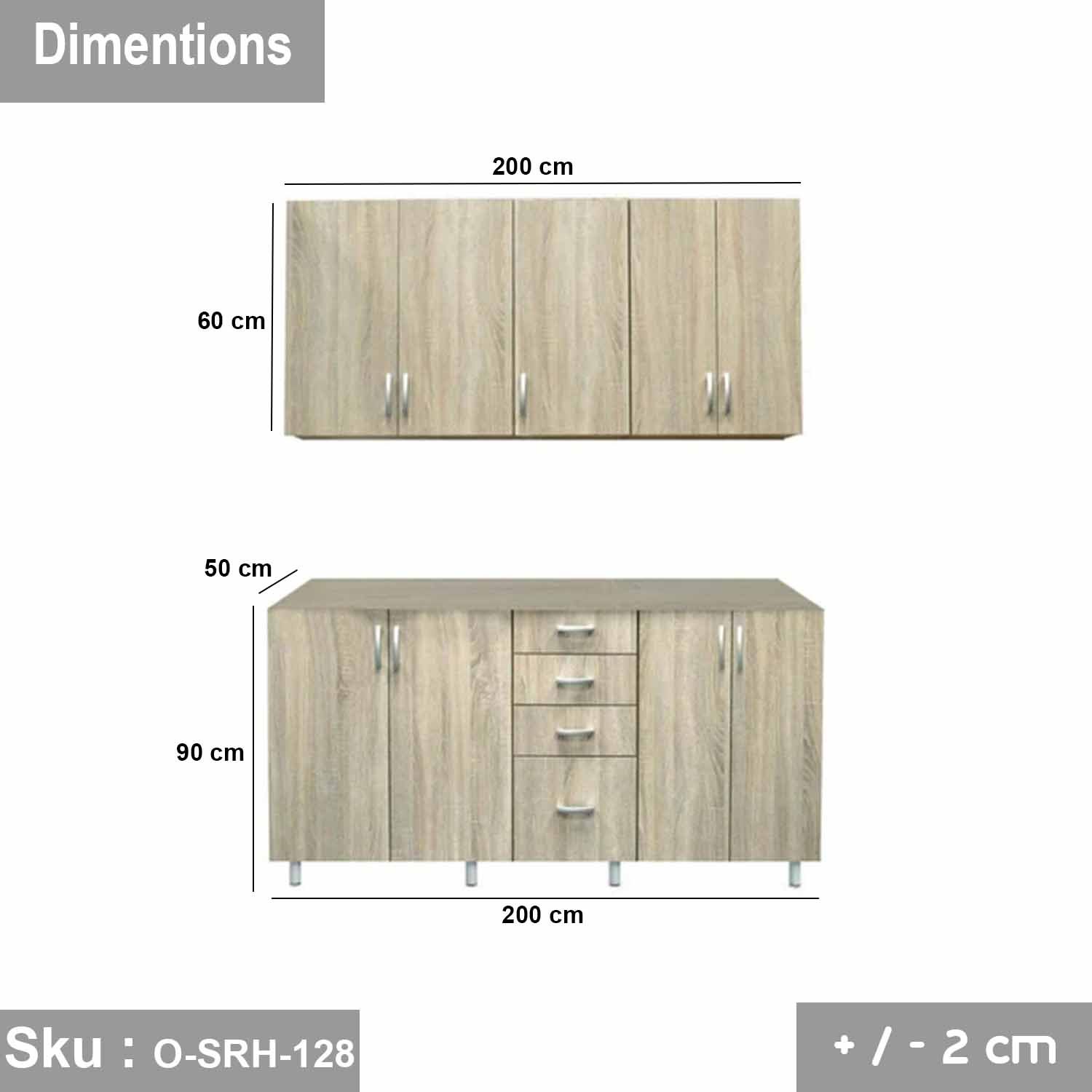 Upper unit size: width 200 cm – depth 30 cm – height 60 cm