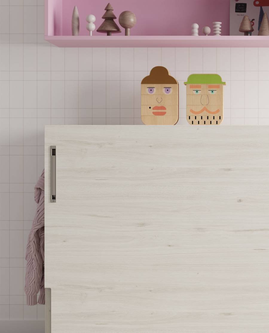 The integrated handles also function as legs on the single and lower beds. They lower automatically by gravity and have a hidden locking system that prevents them from folding unintentionally when they are resting on the floor. These can be adjusted and levelled to ensure correct placement, as the programme has included hidden levellers in the furniture structure that can be adjusted from the inside.