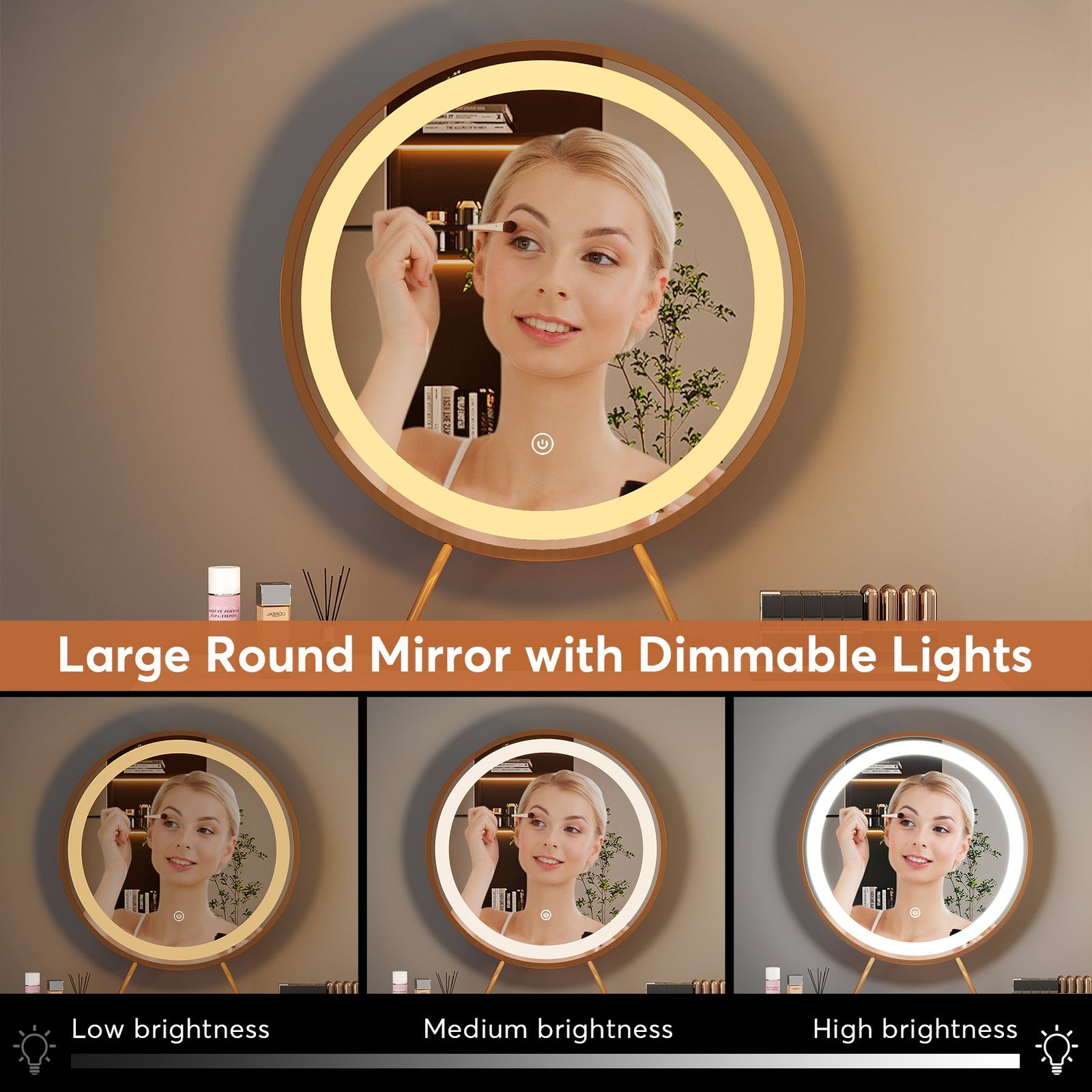 Modern White Gold Makeup Vanity with Large Lighted Mirror ? The large round mirror gives you much room to do hair/makeup without worrying about bending over or scrunching down to fit into a small mirror. Dimmable LED bulbs provide a great amount of light for makeup or skincare.