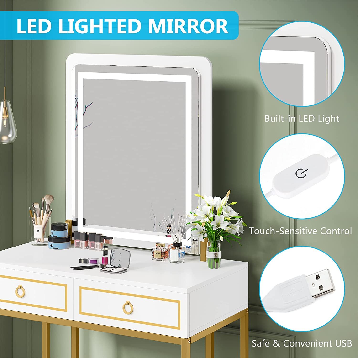 LARGE MIRROR WITH LIGHTS ? The mirror of this vanity desk is surrounded by a built-in LED lights bar and powered by USB, which is safer than an ordinary bulb design. Simply touch the switch to get a soft and bright cool white light, with no flicker and dazzling. Focus time and energy on your beauty, Never mind these fussy operations!