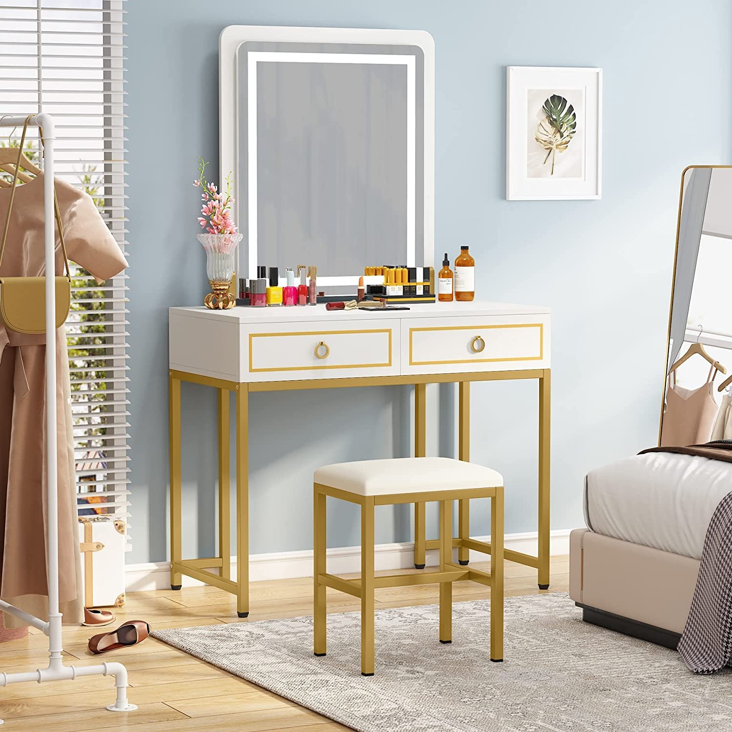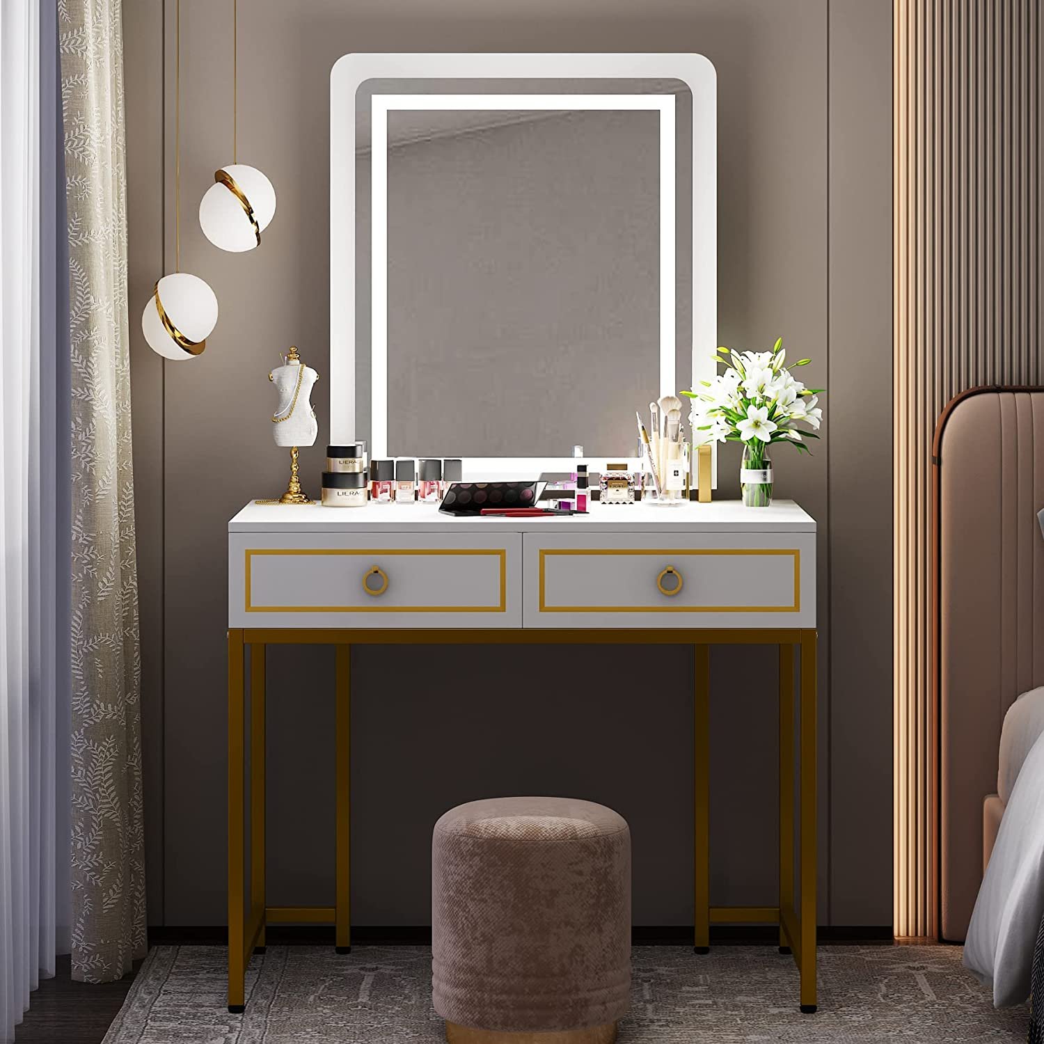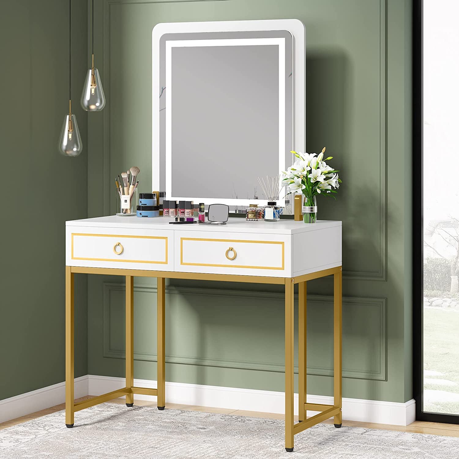 Vanity, Modern Makeup Vanity Table with LED Lights and 2 Drawers