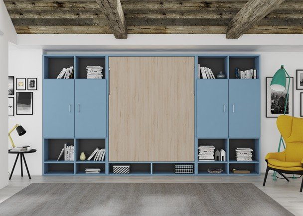 Este ambiente corresponde a una composición mural con una cama abatible vertical de la serie WALLBED, de Tetris Systems, ubicada en una posición central, que se enmarca a ambos lados con dos armarios con puertas batientes y huecos.