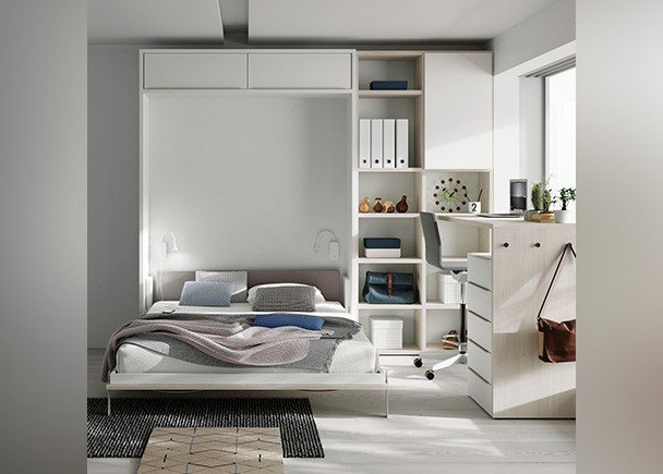 Youth bedroom equipped with a vertical folding bed with a loft, for a 150 x 190 mattress. Next to the bed, a bookcase has been placed that combines openings with doors. One of the shelves extends to give way to the study area, consisting of a straight desk on a blind base, of XL height, which requires the use of a high stool. This novel concept gives slenderness to the whole and reduces the visual weight of the vertical elements. A 5-drawer module has been placed under the desk.
