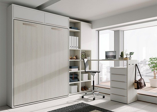 Vertical folding bed measuring 150 x 190 + bookcase and study area.