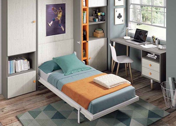 Youth room, equipped with a vertical folding bed for a 90 x 190 mattress. The furniture placed to the right and left of the bed have been arranged asymmetrically; on the right there is first a tall bookcase in a contrasting tone and a vertical module with an upper and lower door with a central gap. Next, the study area has been placed perpendicularly next to the large window, thus trying to provide the greatest possible amount of light to the work area.